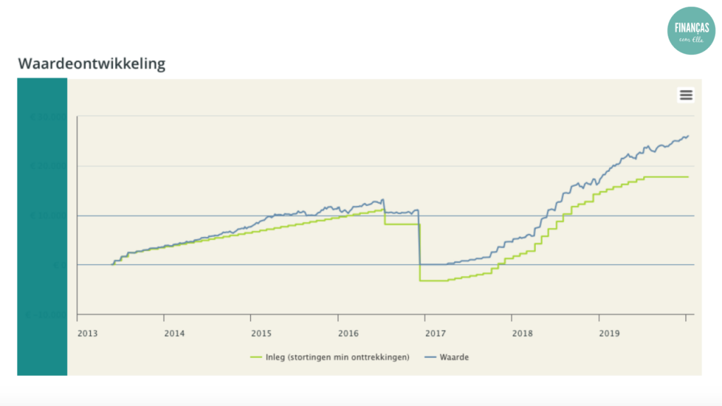 Nas retas verticais entre 2016 e 1017 eu retirei dinheiro para outro investimento. E ATENÇÃO!!! Não é nada aconselhável investir em ETFs, quando depois vais precisar desse dinheiro. Porque imagina que eu teria o azar de na altura que precisava desse dinheiro, a bolsa estar em queda. Perdia imenso dinheiro! Portanto isto foi uma falha minha como investidora.