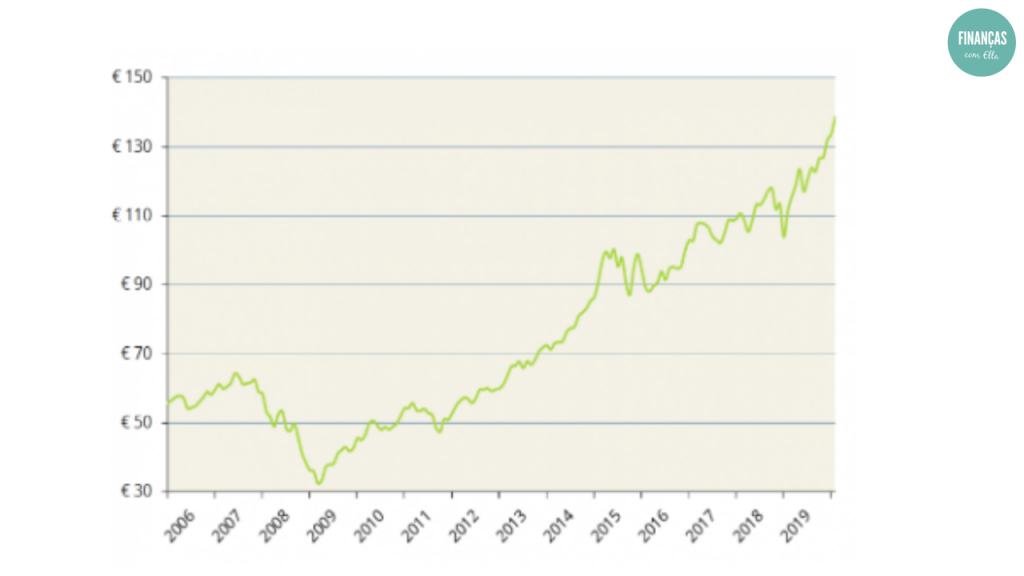 Escolhi investir neste ETF porque conseguia despender algum dinheiro e pô-lo em risco, com a expectativa de ter uma rentabilidade boa. Já tinha o meu fundo de emergência, já tinha as despesas todas bem calculadas e todas as finanças pessoais bem organizadas e então decidi que com este montante mensal eu poderia arriscar. E como investia para o longo prazo, isso no fundo baixava um pouco o risco. Sabia que não ia precisar daquele dinheiro e se houvesse quedas, eu deixava me estar quieta até recuperar o capital. Mas pronto até agora não houve grandes quedas, como já vão ver no gráfico.